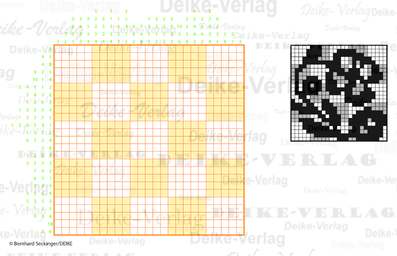 Die Zahlen am Rand geben in der richtigen Reihenfolge an, wie viele aufeinanderfolgende Felder in der entsprechenden Zeile oder Spalte zu schwärzen sind. Wenn Sie alles richtig ausgefüllt haben, erhalten Sie das Motiv.
