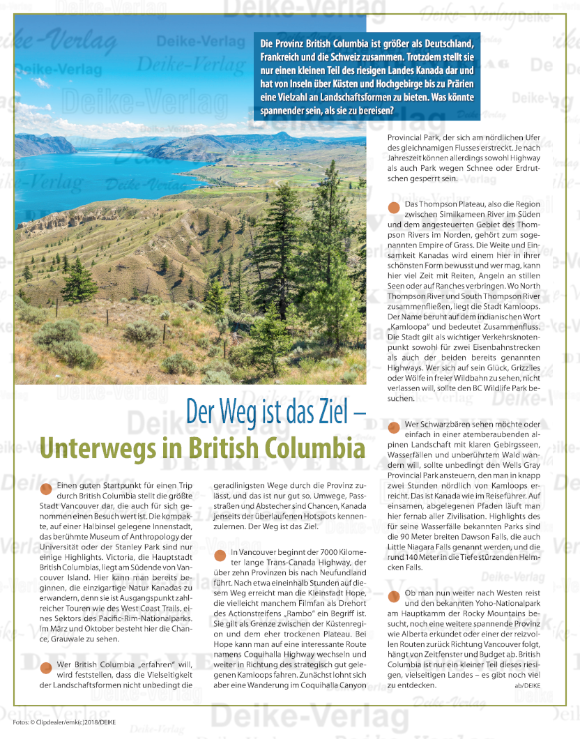 Die Provinz British Columbia ist größer als Deutschland, Frankreich und die Schweiz zusammen. Trotzdem stellt sie nur einen kleinen Teil des riesigen Landes Kanada dar und hat von Inseln über Küsten und Hochgebirge bis zu Prärien eine Vielzahl an Landschaftsformen zu bieten. Was könnte spannender sein, als sie zu bereisen?