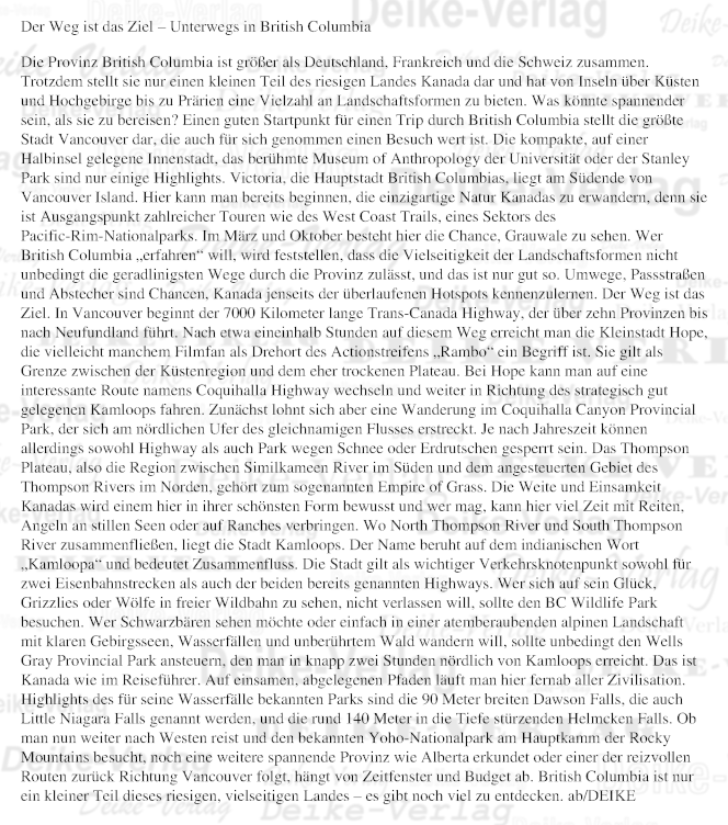 Die Provinz British Columbia ist größer als Deutschland, Frankreich und die Schweiz zusammen. Trotzdem stellt sie nur einen kleinen Teil des riesigen Landes Kanada dar und hat von Inseln über Küsten und Hochgebirge bis zu Prärien eine Vielzahl an Landschaftsformen zu bieten. Was könnte spannender sein, als sie zu bereisen?