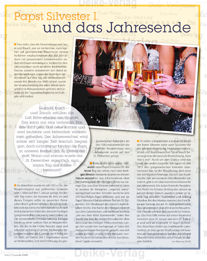 Thema: Silvester Geknall, Krach und Rauch erfüllen die Luft, Blitze erhellen den Himmel. Das kann nur eins bedeuten: Das alte Jahr geht, das neue kommt und wird lautstark und farbenfroh willkommen geheißen. Der Jahreswechsel wird schon seit langer Zeit feierlich begangen, doch nicht immer fanden die Feste in unseren Breiten am 31.Dezember statt. Wann und warum wurde der 31.Dezember eigentlich zum letzten Tag des Jahres bestimmt?