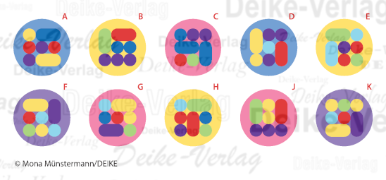 Welche Abbildungen von A bis K sind identisch und bilden ein Paar? Die Farben spielen dabei keine Rolle.