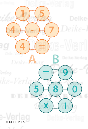 Finden Sie einen zusammenhängenden Weg, der jedes Sechseck genau ein Mal so beschreitet, dass sich eine stimmige Rechnung ergibt.