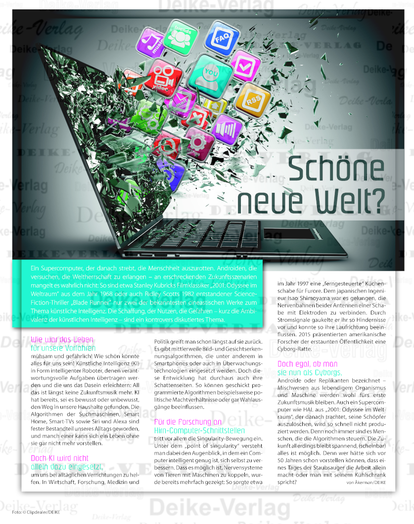 Thema: Künstliche Intelligenz Ein Supercomputer, der danach strebt, die Menschheit auszurotten. Androiden, die versuchen, die Weltherrschaft zu erlangen – an erschreckenden Zukunftsszenarien mangelt es wahrlich nicht: So sind etwa Stanley Kubricks Filmklassiker „2001: Odyssee im Weltraum“ aus dem Jahr 1968 oder auch Ridley Scotts 1982 entstandener Science-Fiction-Thriller „Blade Runner“ nur zwei der bekanntesten cineastischen Werke zum Thema künstliche Intelligenz.