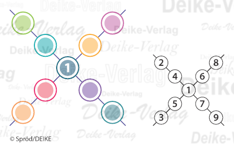 Setzen Sie die Zahlen von 1 bis 9 so ein, dass die Summe auf jeder Geraden gleich ist.