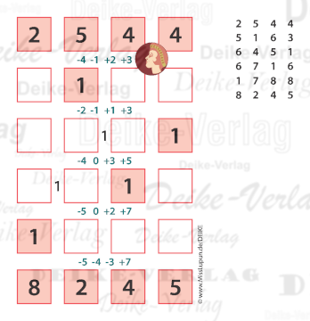 Um von den vier Anfangs- zu den vier Endziffern zu gelangen, müssen Zeile für Zeile jeweils vier Rechnungen (plus und minus) ausgeführt werden.