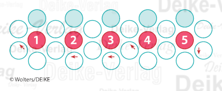 Die Wörter beginnen im Pfeilfeld und laufen im Uhrzeigersinn um das Zahlenfeld herum.